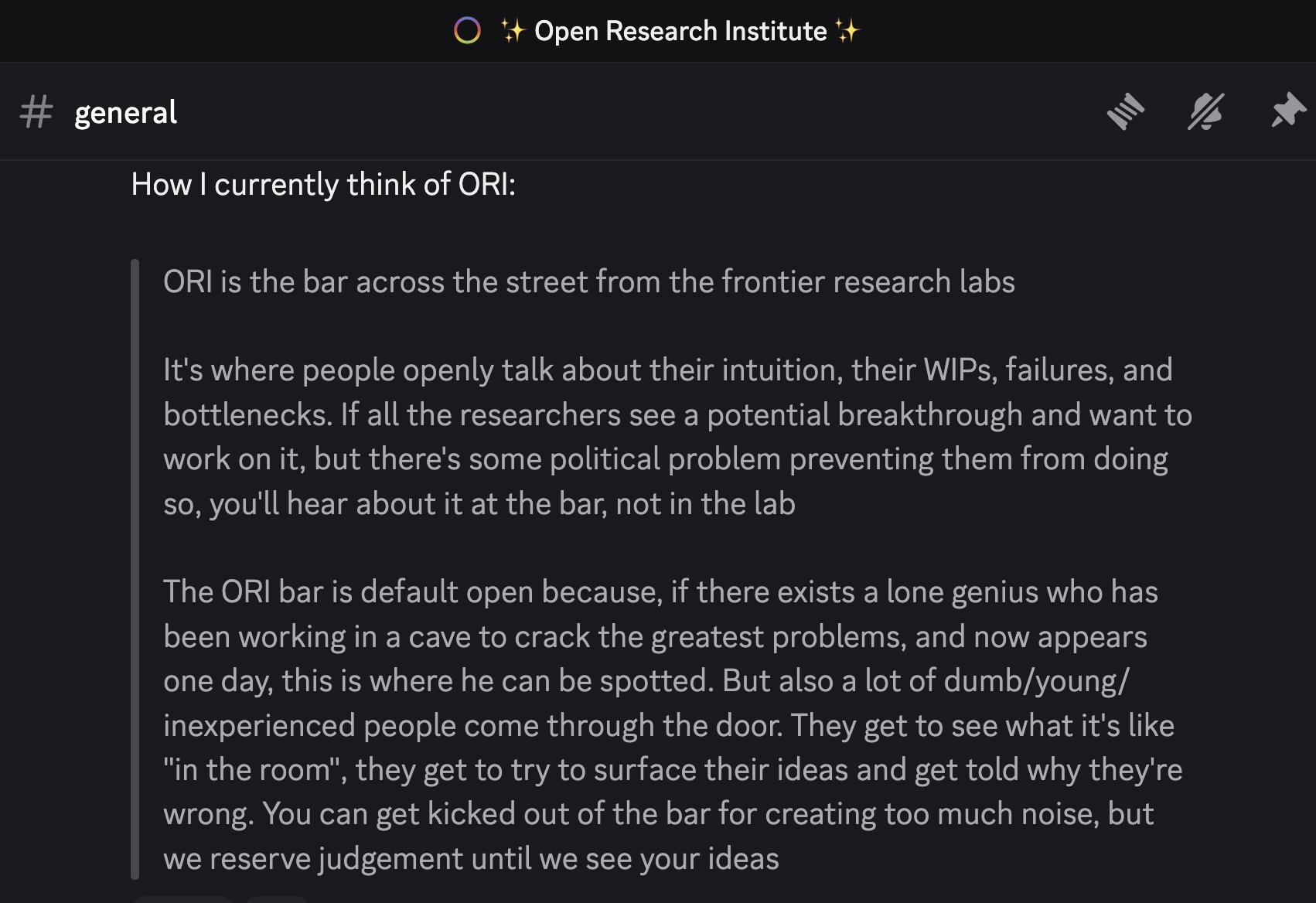 ORI is the "open research institute". Its purpose is to map the frontier of human knowledge & maintain the fastest highway from it to the backtier, and back
